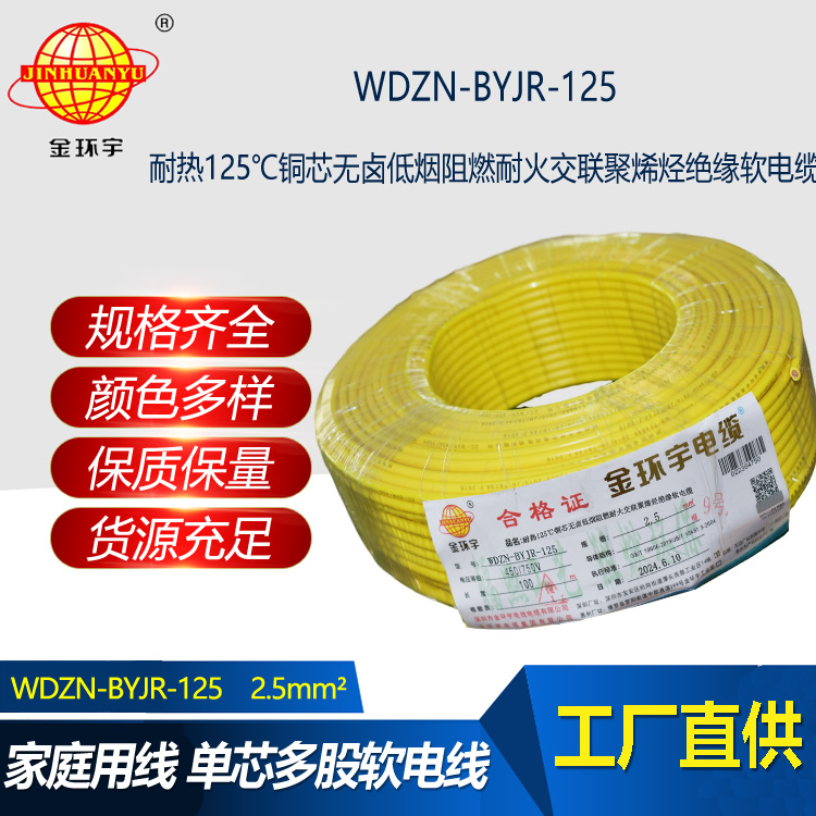WDZN-BYJR-125是一種交聯(lián)聚乙烯新型裝修的布電線。WDZN-BYJR-125布電線的特點(diǎn)就是低煙量、無鹵素、阻燃、耐火。每個字母代表的意思:W代表無鹵;D代表低煙;Z代表阻燃;N代表耐火;125代表溫度可達(dá)到125℃,YJ代表交聯(lián)聚乙烯絕緣;R代表軟。其導(dǎo)體主要是銅線,有薄的絕緣層和良好的電氣機(jī)械性能,以及耐熱、防潮、耐溶劑等性能,選用不同的絕緣材料可獲得不同的特性。
